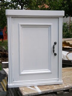 A sütő elem még kap egy réteg festéket, de az eredetileg egy gomb fogantyút már kivettem, és a helyét betömtem egy fadarabbal, amit száradás után lefűrészeltem, megcsiszoltam,így a kb 2 cm átmérőjű lyuk teljesen el is tűnt.