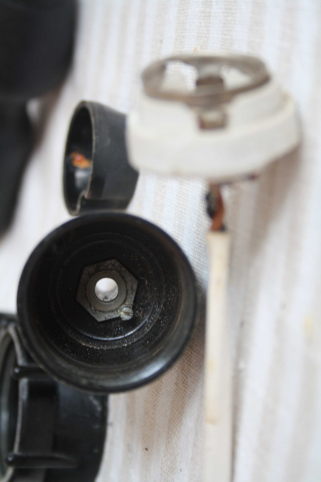 Az első lépés a foglalat rögzítése lesz a lámpatestre, amit én a másik, régi foglalat menetes csövével oldottam meg, ami egy apró kis csavarral volt az előző foglalthoz fogva (l. feljebb, a szétrobbantott régi szerelékek képénél).